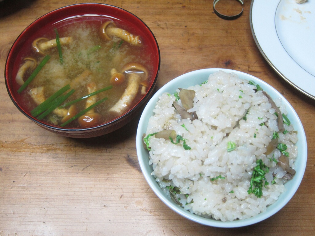 【山菜まぜご飯とな めこあさつき味噌汁】 (GORRY)