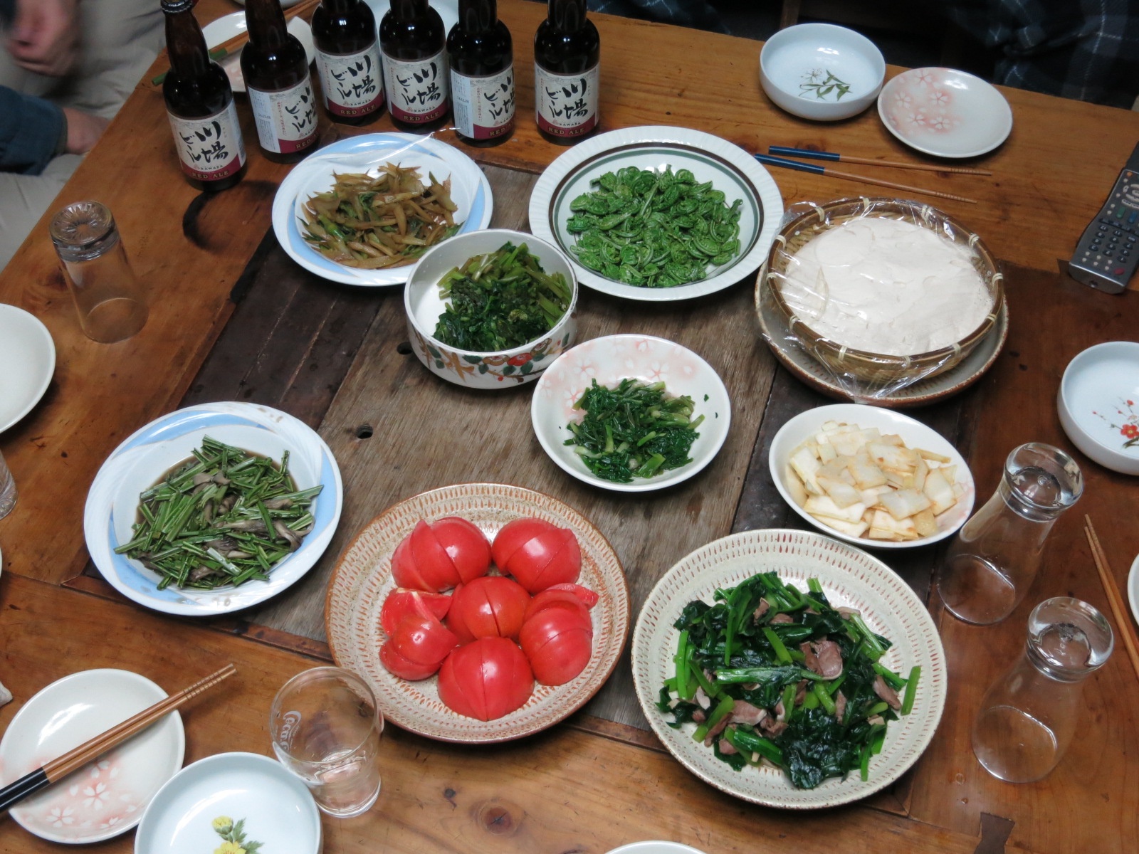 【夕飯開始@山小屋】 (GORRY) 尾瀬ドーフ、うど酢味噌和え、行者にんにくと豚タン炒め、こごみマヨ和え、せりお浸し、葉山葵醤油漬け、うどきんぴら、こごみと舞茸炒め、トマト