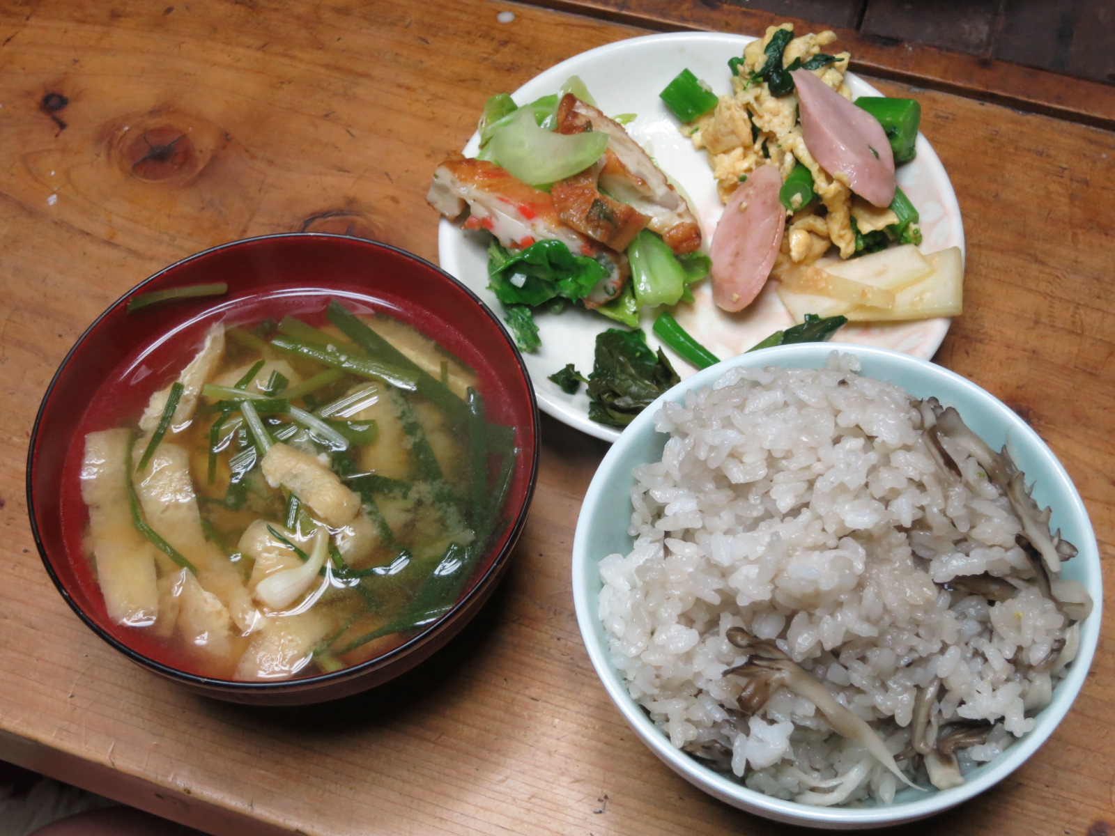 【舞茸ご飯、あさつきの味噌汁、薩摩揚げと春キャベツ炒め、魚肉ソーセージと菜の花の炒り卵】 (GORRY)